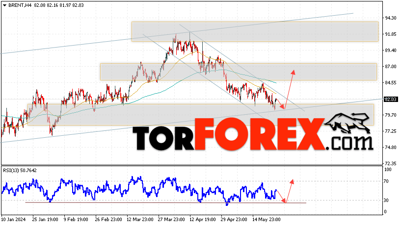 Дополнительным сигналом в пользу подъёма котировок и цен на нефть Brent выступит тест линии поддержки на индикаторе относительной силы (RSI). Вторым сигналом станет отбой от верхней границы медвежьего канала. Отменой варианта роста цен на нефть станет падение цен и пробой уровня 78.45 долларов за баррель. Это укажет на пробой области поддержки и продолжение падения котировок BRENT в область ниже уровня 72.65. Подтверждением росту котировок и цен на нефть выступит пробой области сопротивления и закрытие цен на Brent выше уровня 84.65, что укажет на пробой верхней границы нисходящего канала.