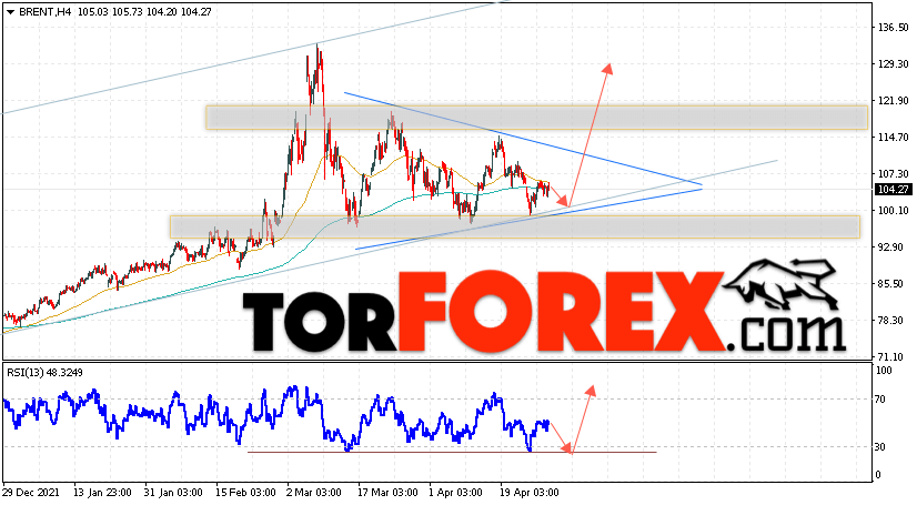 Дополнительным сигналом в пользу подъёма котировок и цен на нефть Brent выступит тест линии тренда на индикаторе относительной силы (RSI). Вторым сигналом станет отскок от нижней границы модели ”Треугольник”. Отменой варианта подъёма цен на нефть станет падение и пробой уровня 93.05 долларов за баррель. Это укажет на пробой области поддержки и продолжение падения котировок BRENT в область ниже уровня 85.05. Подтверждением подъёму котировок выступит пробой области сопротивления и закрытие цен на Brent выше уровня 116.05, что укажет на пробой верхней границы модели ”Треугольник” и начало отработки паттерна.