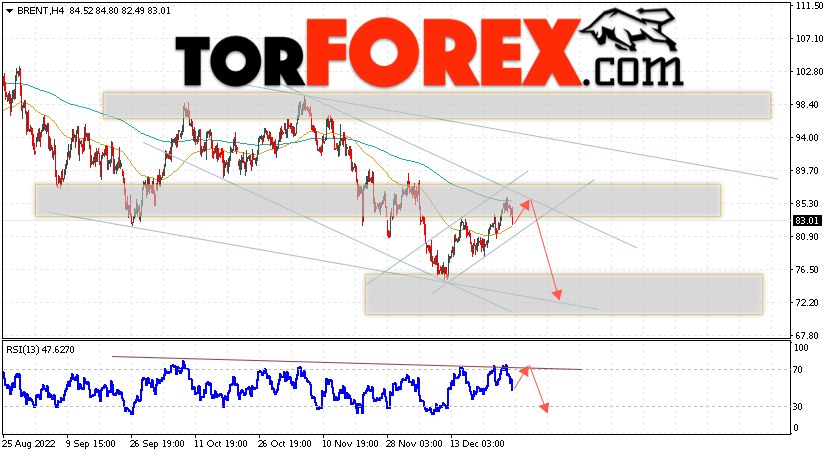 Дополнительным сигналом в пользу снижения котировок и цен на нефть Brent выступит тест линии сопротивления на индикаторе относительной силы (RSI). Вторым сигналом станет отбой верхней границы нисходящего канала. Отменой варианта падения цен на нефть станет сильный рост и пробой уровня 88.65 долларов за баррель. Это укажет на пробой области сопротивления и продолжение роста котировок BRENT в область выше уровня 94.05. Подтверждением падению котировок выступит пробой области поддержки и закрытие цен на Brent ниже уровня 78.45, что укажет на пробой нижней границы бычьего канала.
