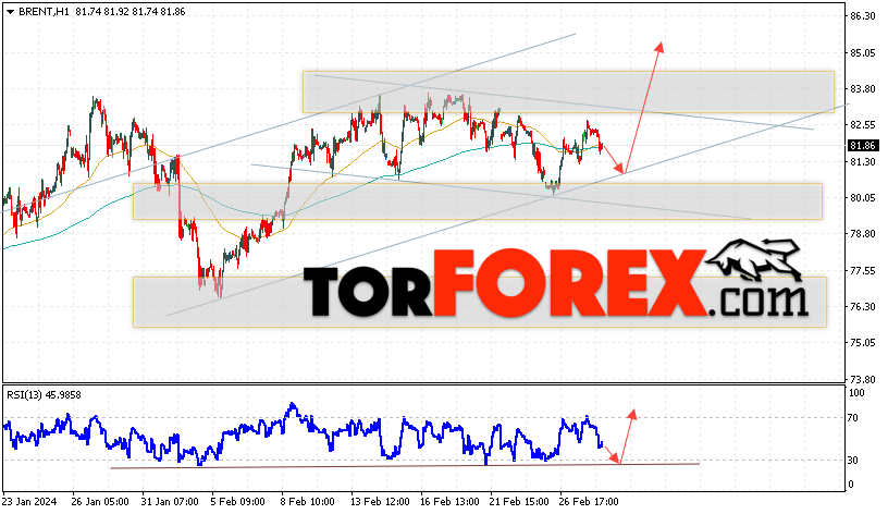 Дополнительным сигналом в пользу роста котировок и цен на нефть Brent выступит тест линии поддержки на индикаторе относительной силы (RSI). Вторым сигналом станет отбой от нижней границы бычьего канала. Отменой варианта роста цен на нефть станет падение цен и пробой уровня 77.65 долларов за баррель. Это укажет на пробой области поддержки и продолжение падения котировок BRENT в область ниже уровня 67.55. Подтверждением роста котировок и цен на нефть выступит пробой области сопротивления и закрытие цен на Brent выше уровня 84.05, что укажет на пробой верхней границы медвежьего канала коррекции.