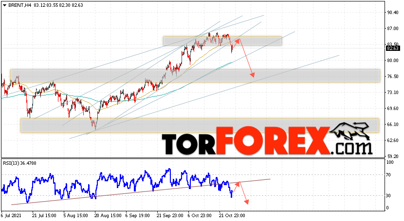 Дополнительным сигналом в пользу снижения котировок и цен на нефть Brent выступит тест линии пробитой линий тренда на индикаторе относительной силы (RSI). Вторым сигналом станет отскок от нижней границы бычьего канала. Отменой варианта падения цен на нефть станет сильный рост и пробой уровня 87.05 долларов за баррель. Это укажет на пробой области сопротивления и продолжение подъёма котировок BRENT в область выше уровня 89.85. Подтверждением падения котировок выступит пробой уровня поддержки и закрытие цен на Brent ниже уровня 79.05, что укажет на пробой нижней границы бычьего канала.