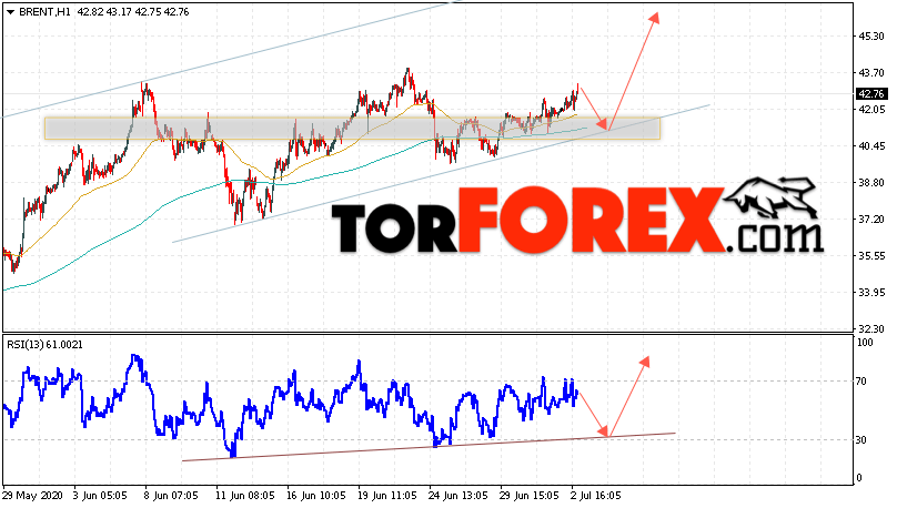 Дополнительным сигналом в пользу подъёма котировок и цен на нефть Brent выступит тест линии тренда на индикаторе относительной силы (RSI). Вторым сигналом станет отскок от нижней границы восходящего канала. Отменой варианта подъёма цен на нефть станет падение цен и пробой уровня 39.05 долларов за баррель. Это укажет на пробой области поддержки и продолжение падения котировок BRENT в область ниже уровня 35.65. Подтверждением подъёма котировок выступит пробой уровня сопротивления и закрытие цен на Brent выше уровня 45.05.