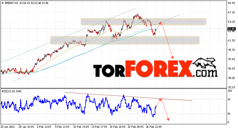 Дополнительным сигналом в пользу падения котировок и цен на нефть Brent выступит тест линии тренда на индикаторе относительной силы (RSI). Вторым сигналом станет отскок от нижней границы восходящего канала. Отменой варианта падения цен на нефть станет сильный рост и пробой уровня 67.25 долларов за баррель. Это укажет на пробой области сопротивления и продолжение роста котировок BRENT в область выше уровня 72.05. Подтверждением падения котировок выступит пробой уровня поддержки и закрытие цен на Brent ниже уровня 61.35.
