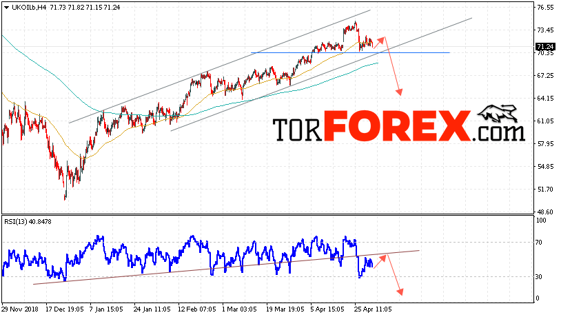 Таким образом, Аналитика и прогноз цен на нефть на 3 мая 2019 предполагает попытку теста уровня сопротивления вблизи области 72.45. Далее, продолжение падения с целью ниже уровня 64.15. В пользу снижения выступит тест линии тренда на индикаторе относительной силы. Отменой варианта падения цены нефти BRENT станет сильный рост и пробой уровня 74.15. Это укажет на продолжение подъёма котировок в область выше уровня 76.45.
