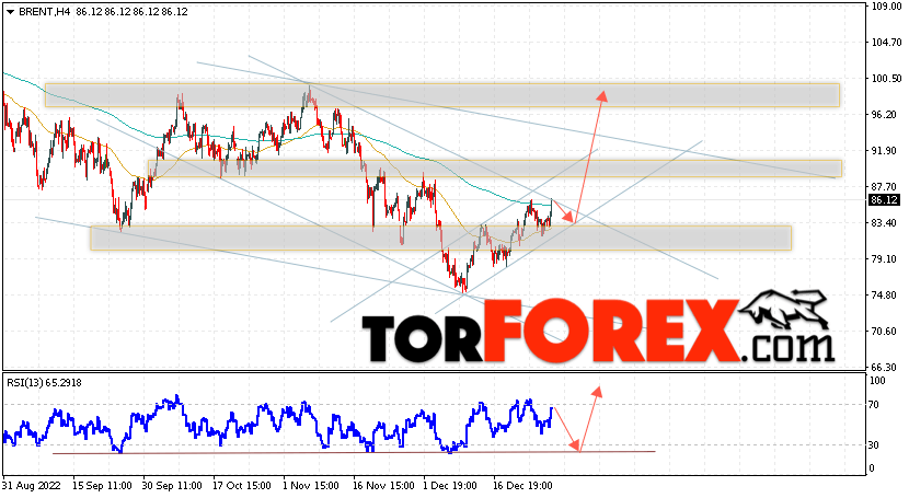Дополнительным сигналом в пользу роста котировок и цен на нефть Brent выступит тест линии поддержки на индикаторе относительной силы (RSI). Вторым сигналом станет отбой нижней границы бычьего канала. Отменой варианта подъёма цен на нефть станет падение и пробой уровня 79.05 долларов за баррель. Это укажет на пробой области поддержки и продолжение падения котировок BRENT в область ниже уровня 72.45. Подтверждением роста котировок выступит пробой области сопротивления и закрытие цен на Brent выше уровня 89.65, что укажет на пробой верхней границы нисходящего канала.