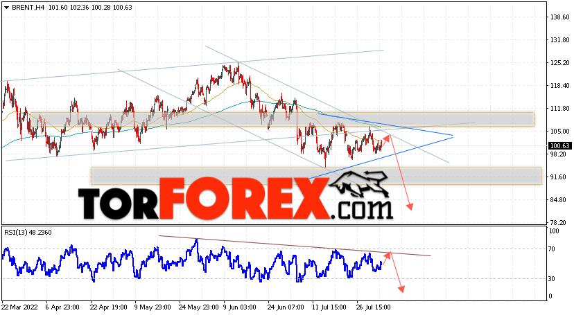 Дополнительным сигналом в пользу падения котировок и цен на нефть Brent выступит тест линии поддержки на индикаторе относительной силы (RSI). Вторым сигналом станет отскок от верхней границы модели ”Треугольник”. Отменой варианта падения цен на нефть станет сильный рост и пробой уровня 113.55 долларов за баррель. Это укажет на пробой области сопротивления и продолжение роста котировок BRENT в область выше уровня 120.05. Подтверждением падению котировок выступит пробой нижней границы модели ”Треугольник” и закрытие цен на Brent ниже уровня 93.55, что укажет на начало отработки модели с целями внизу.