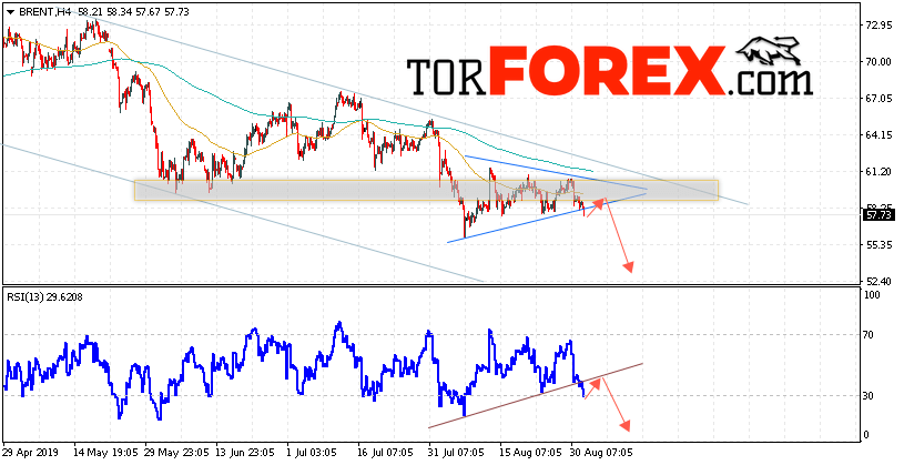 Таким образом, Аналитика и прогноз цен на нефть на 4 сентября 2019 предполагает попытку теста уровня сопротивления вблизи области 58.55. Далее, продолжение падения с целью ниже уровня 52.45. В пользу снижения выступит тест линии тренда на индикаторе относительной силы. Отменой варианта падения цены нефти Brent станет сильный рост и пробой уровня 62.05. Это укажет на продолжение подъёма котировок в область выше уровня 65.65.