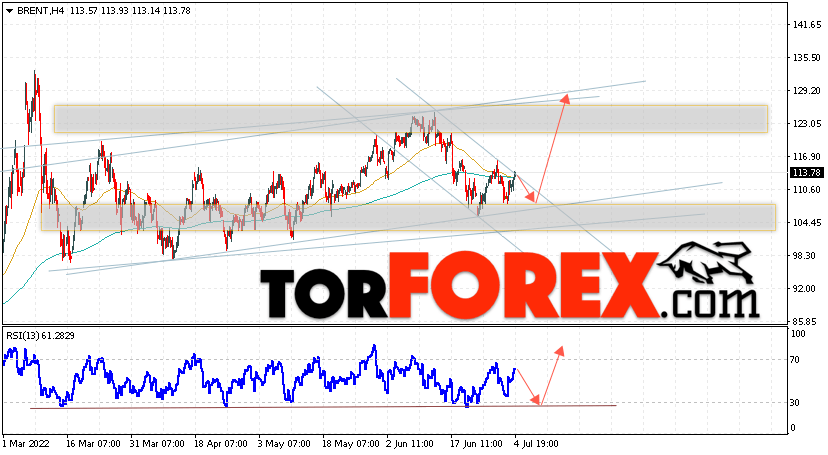 Дополнительным сигналом в пользу подъёма котировок и цен на нефть Brent выступит тест линии тренда на индикаторе относительной силы (RSI). Вторым сигналом станет отскок от нижней границы бычьего канала. Отменой варианта роста цен на нефть станет падение и пробой уровня 99.05 долларов за баррель. Это укажет на пробой области поддержки и продолжение падения котировок BRENT в область ниже уровня 92.45. Подтверждением росту котировок выступит пробой верхней границы нисходящего канала и закрытие цен на Brent выше уровня 117.65, что укажет на пробой верхней границы медвежьего канала коррекции.