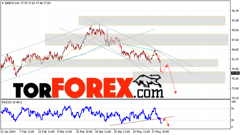 Дополнительным сигналом в пользу снижения котировок и цен на нефть Brent выступит тест линии сопротивления на индикаторе относительной силы (RSI). Вторым сигналом станет отбой от верхней границы медвежьего канала. Отменой варианта падения цен на нефть станет сильный рост цен и пробой уровня 83.85 долларов за баррель. Это укажет на пробой области сопротивления и продолжение роста котировок BRENT в область выше уровня 94.05. Подтверждением падению котировок и цен на нефть выступит пробой области поддержки и закрытие цен на Brent ниже уровня 75.05.
