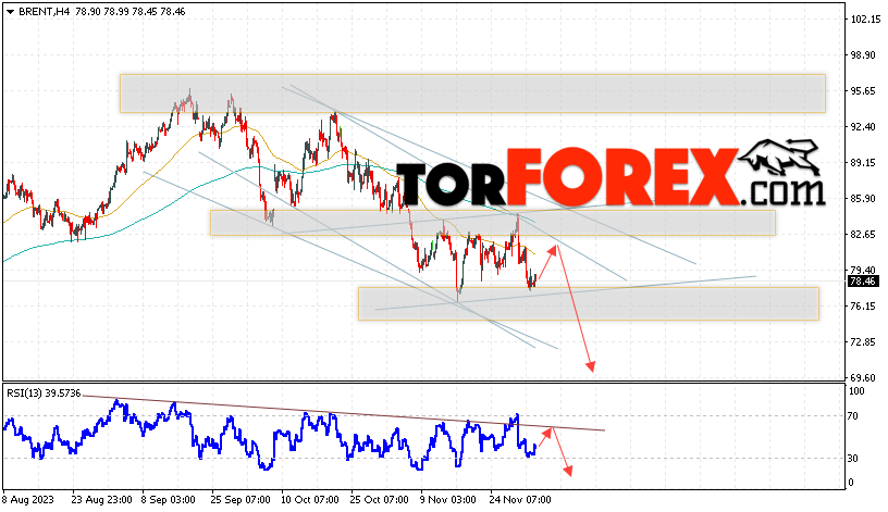 Дополнительным сигналом в пользу падения котировок и цен на нефть Brent выступит тест линии сопротивления на индикаторе относительной силы (RSI). Вторым сигналом станет отбой от верхней границы медвежьего канала. Отменой варианта снижения цен на нефть станет сильный рост цен и пробой уровня 86.75 долларов за баррель. Это укажет на пробой области сопротивления и продолжение роста котировок BRENT в область выше уровня 94.65. Подтверждением падению котировок и цен на нефть выступит пробой области поддержки и закрытие цен на Brent ниже уровня 74.75, что укажет на пробой нижней границы бычьего канала коррекции.