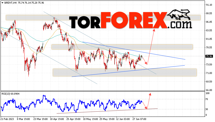 Дополнительным сигналом в пользу роста котировок и цен на нефть Brent выступит тест линии поддержки на индикаторе относительной силы (RSI). Вторым сигналом станет отбой от верхней границы медвежьего канала. Отменой варианта подъёма цен на нефть станет падение и пробой уровня 71.05 долларов за баррель. Это укажет на пробой области поддержки и продолжение падения котировок BRENT в область ниже уровня 62.55. Подтверждением росту котировок и цен на нефть выступит пробой области сопротивления и закрытие цен на Brent выше уровня 79.05, что укажет на пробой верхней границы модели «Треугольник» и начало отработки паттерна с целями вверху.