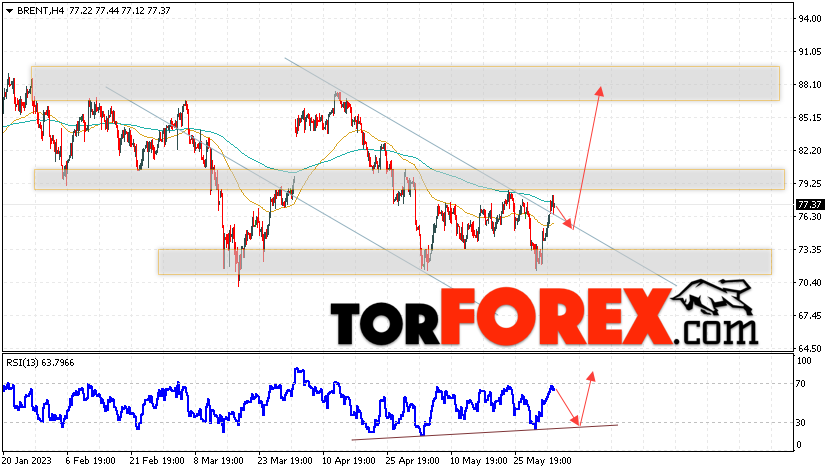 Дополнительным сигналом в пользу подъёма котировок и цен на нефть Brent выступит тест линии поддержки на индикаторе относительной силы (RSI). Вторым сигналом станет отбой от верхней границы нисходящего канала, который был пробит покупателями вверх. Отменой варианта подъёма цен на нефть станет падение и пробой уровня 70.05 долларов за баррель. Это укажет на пробой области поддержки и продолжение падения котировок BRENT в область ниже уровня 64.05. Подтверждением подъёму котировок выступит пробой области сопротивления и закрытие цен на Brent выше уровня 79.65, что укажет на завершение формирования разворотной модели «Двойное дно» и начало отработки паттерна с целями вверху.
