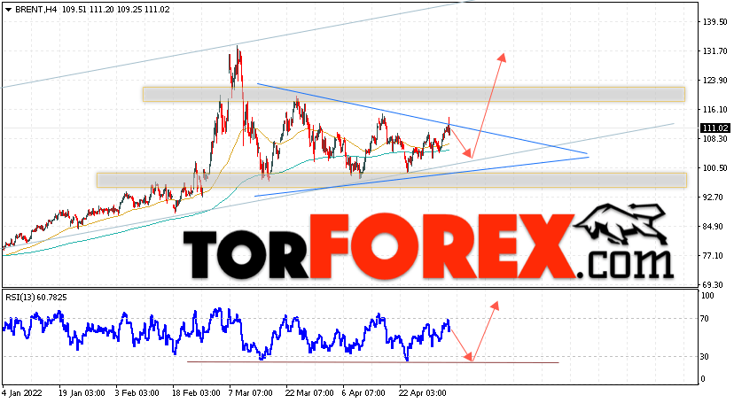 Котировки нефти марки Brent продолжают движение в рамках подъёма и формирования модели ”Треугольник”. В момент публикации прогноза цена нефти марки Brent составляет 111.02 долларов за баррель. Скользящие средние указывают на наличие краткосрочной бычьей тенденции по нефти. Цены пробили область между сигнальными линиями вверх, что указывает на давление со стороны покупателей ”Черного Золота” и потенциальное продолжение роста стоимости актива уже с текущих уровней. На данный момент стоит ожидать попытку развития падения и тест уровня поддержки вблизи области 100.55 доллара за баррель. Далее, продолжение роста курса нефти в область выше уровня 131.75.