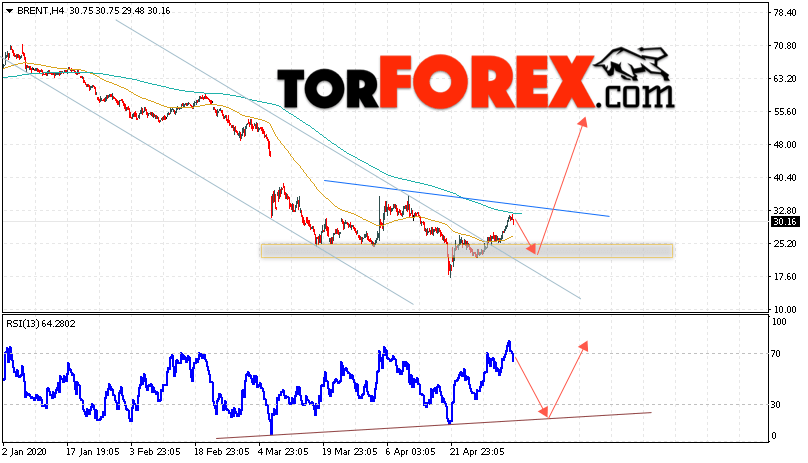 Дополнительным сигналом в пользу подъёма котировок и цен на нефть Brent выступит тест линии тренда на индикаторе относительной силы (RSI). Вторым сигналом станет отскок от верхней границы нисходящего канала. Отменой варианта подъёма цен на нефть станет падение цен и пробой уровня 17.05 долларов за баррель. Это укажет на пробой области поддержки и продолжение падения котировок BRENT в область ниже уровня 10.55. Подтверждением подъёма котировок выступит пробой линии тренда и закрытие цен на Brent выше уровня 34.05, что укажет на завершение формирования перевернутой модели «Голова и плечи»