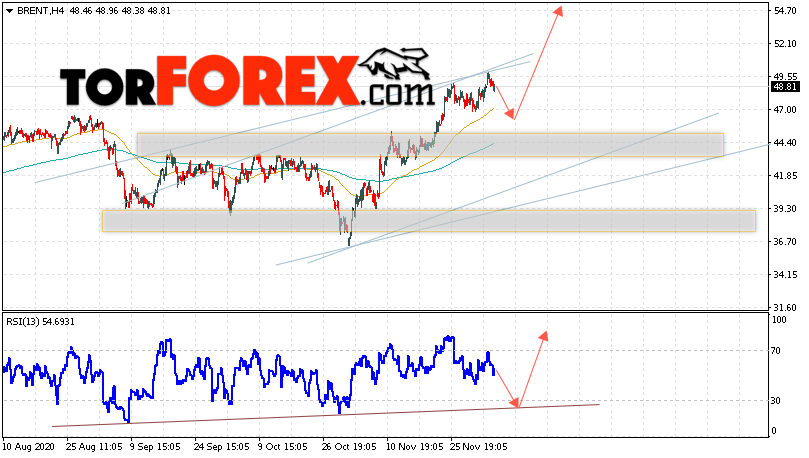 Дополнительным сигналом в пользу роста котировок и цен на нефть Brent выступит тест восходящей линии тренда на индикаторе относительной силы (RSI). Вторым сигналом станет отскок от уровня поддержки на графике цены. Отменой варианта подъёма цен на нефть станет падение и пробой уровня 43.55 долларов за баррель. Это укажет на пробой области поддержки и продолжение падения котировок BRENT в область ниже уровня 37.55. Подтверждением роста котировок выступит пробой уровня сопротивления и закрытие цен на Brent выше уровня 50.25.