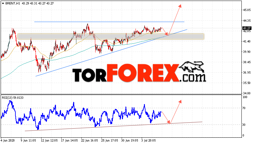 Дополнительным сигналом в пользу подъёма котировок и цен на нефть Brent выступит тест линии тренда на индикаторе относительной силы (RSI). Вторым сигналом станет отскок от нижней границы модели «Треугольник». Отменой варианта подъёма цен на нефть станет падение цен и пробой уровня 41.05 долларов за баррель. Это укажет на пробой области поддержки и продолжение падения котировок BRENT в область ниже уровня 36.75. Подтверждением подъёма котировок выступит пробой уровня сопротивления и закрытие цен на Brent выше уровня 45.05.