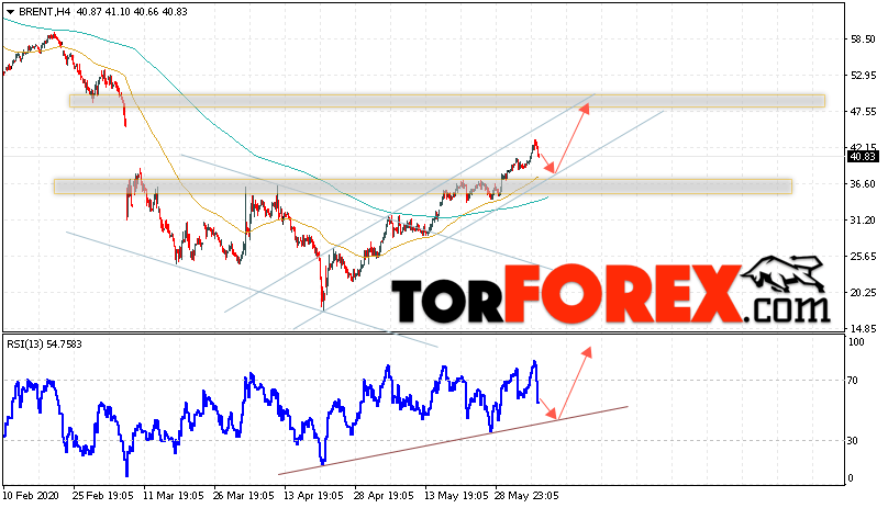 Дополнительным сигналом в пользу подъёма котировок и цен на нефть Brent выступит тест линии тренда на индикаторе относительной силы (RSI). Вторым сигналом станет отскок от нижней границы восходящего канала. Отменой варианта подъёма цен на нефть станет падение цен и пробой уровня 35.05 долларов за баррель. Это укажет на пробой области поддержки и продолжение падения котировок BRENT в область ниже уровня 30.05. Подтверждением подъёма котировок выступит пробой уровня сопротивления и закрытие цен на Brent выше уровня 42.55.