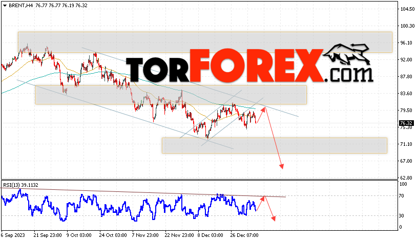 Дополнительным сигналом в пользу снижения котировок и цен на нефть Brent выступит тест линии сопротивления на индикаторе относительной силы (RSI). Вторым сигналом станет отбой от верхней границы нисходящего канала. Отменой варианта падения цен на нефть станет сильный рост цен и пробой уровня 84.05 долларов за баррель. Это укажет на пробой области сопротивления и продолжение роста котировок BRENT в область выше уровня 95.05. Подтверждением падению котировок и цен на нефть выступит пробой области поддержки и закрытие цен на Brent ниже уровня 73.05.