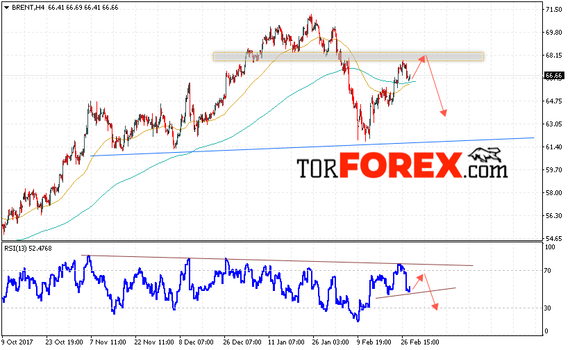 Таким образом, Аналитика и прогноз цен на нефть на 1 марта 2018 предполагает попытку теста уровня сопротивления вблизи области 68.00 и продолжения падения с целью ниже уровня 63.50, отменой варианта падения цены нефти BRENT станет пробой уровня 69.50, что укажет на продолжение роста котировок в область выше уровня 71.50.