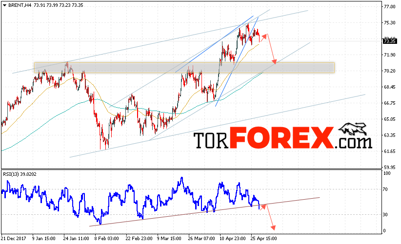 Котировки нефти марки BRENT продолжают движение в рамках коррекции. На данный момент стоит ожидать попытку теста уровня сопротивления вблизи области 73.50 доллар за баррель. Далее продолжение падения нефти в область ниже уровня 70.50.
