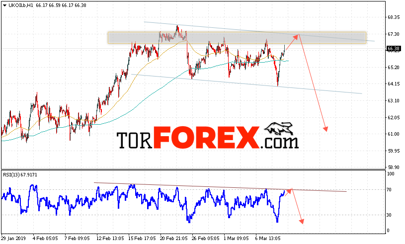 Таким образом, Аналитика и прогноз цен на нефть на 12 марта 2019 предполагает попытку теста уровня сопротивления вблизи области 67.30. Далее, продолжение падения с целью ниже уровня 61.05. В пользу падения выступит тест лини сопротивления на индикаторе относительной силы. Отменой варианта снижения цены нефти BRENT станет сильный рост и пробой уровня 68.35. Это укажет на продолжение роста котировок в область выше уровня 71.65.