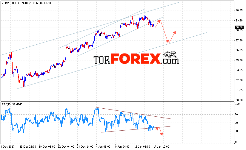 Таким образом, Аналитика и прогноз цен на нефть на 18 января 2018 предполагает попытку падения в область нижней границы восходящего канала вблизи 67.50, откуда стоит ждать продолжения роста, отменой варианта роста цены нефти BRENT станет пробой уровня 66.50, что укажет на продолжение падения котировок в область ниже уровня 62.00.
