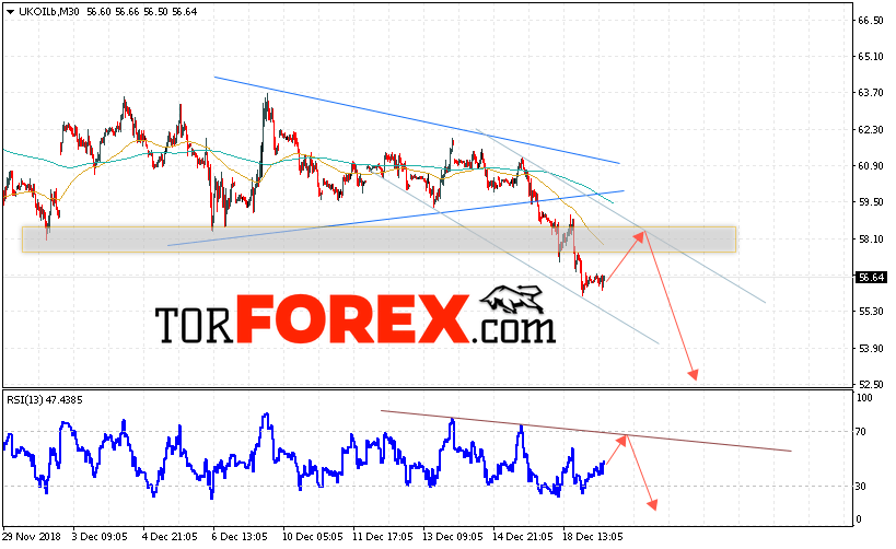 В пользу снижения котировок и цен на нефть BRENT выступит тест линии тренда на индикаторе относительной силы. А также отскок от верхней границы нисходящего канала. Отменой варианта снижения цен на нефть станет сильный рост и пробой уровня 60.00 долларов за баррель. Это укажет на пробой верхней границы канала и продолжение роста котировок в область выше уровня 63.70. Подтверждением падения котировок выступит пробой области поддержки и закрытие цен на BRENT ниже уровня 55.20.
