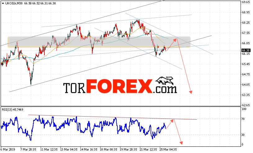 Таким образом, Аналитика и прогноз цен на нефть на 26 марта 2019 предполагает попытку теста уровня сопротивления вблизи области 67.35. Далее, продолжение падения с целью ниже уровня 63.35. В пользу падения выступит тест лини сопротивления на индикаторе относительной силы. Отменой варианта снижения цены нефти BRENT станет сильный рост и пробой уровня 68.05. Это укажет на продолжение роста котировок в область выше уровня 70.65.