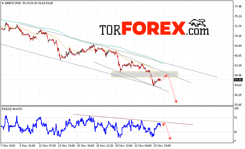 Котировки нефти марки BRENT продолжают движение в рамках нисходящего канала. В момент публикации прогноза цена нефти марки BRENT составляет 59.88 долларов за баррель. На данный момент стоит ожидать попытку теста уровня сопротивления вблизи области 60.95 доллара за баррель. Далее продолжение падения курса нефти в область ниже уровня 53.85.