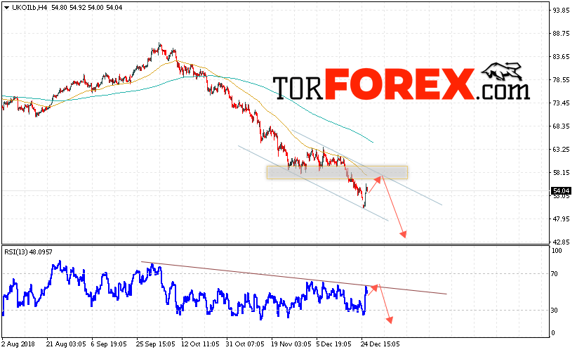 В пользу снижения котировок и цен на нефть BRENT выступит тест линии тренда на индикаторе относительной силы. А также отскок от верхней границы нисходящего канала. Отменой варианта снижения цен на нефть станет сильный рост и пробой уровня 59.50 долларов за баррель. Это укажет на пробой верхней границы канала и продолжение роста котировок в область выше уровня 63.40. Подтверждением снижения котировок выступит пробой области поддержки и закрытие цен на BRENT ниже уровня 48.00.