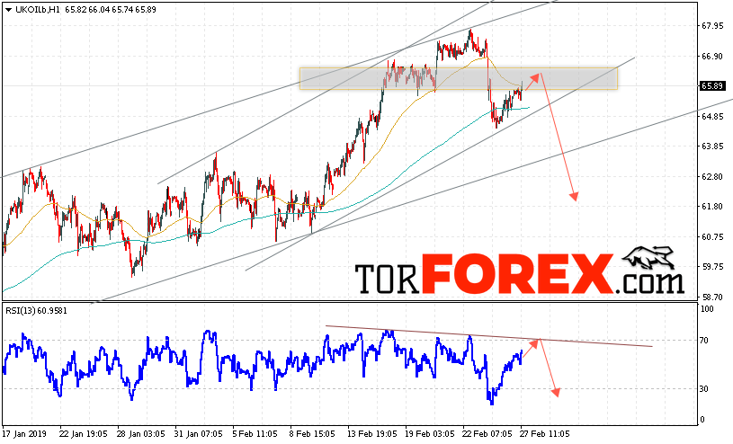 Таким образом, Аналитика и прогноз цен на нефть на 28 февраля 2019 предполагает попытку теста уровня сопротивления вблизи области 66.25. Далее, продолжение падения с целью ниже уровня 61.80. В пользу падения выступит тест лини сопротивления на индикаторе относительной силы. Отменой варианта снижения цены нефти BRENT станет сильный рост и пробой уровня 67.75. Это укажет на продолжение роста котировок в область выше уровня 72.55.