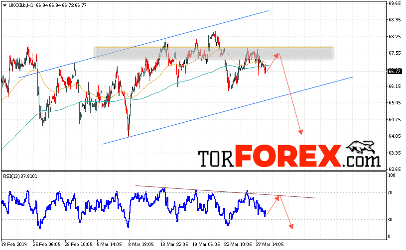 Таким образом, Аналитика и прогноз цен на нефть на 29 марта 2019 предполагает попытку теста уровня сопротивления вблизи области 67.55. Далее, продолжение падения с целью ниже уровня 64.05. В пользу падения выступит тест лини сопротивления на индикаторе относительной силы. Отменой варианта снижения цены нефти BRENT станет сильный рост и пробой уровня 68.95. Это укажет на продолжение роста котировок в область выше уровня 70.45.