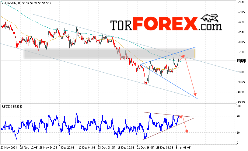 В пользу снижения котировок и цен на нефть BRENT выступит тест линии тренда на индикаторе относительной силы. А также отскок от верхней границы нисходящего канала. Отменой варианта снижения цен на нефть станет сильный рост и пробой уровня 57.95 долларов за баррель. Это укажет на пробой верхней границы канала и продолжение роста котировок в область выше уровня 62.25. Подтверждением снижения котировок выступит пробой области поддержки и закрытие цен на BRENT ниже уровня 52.00.