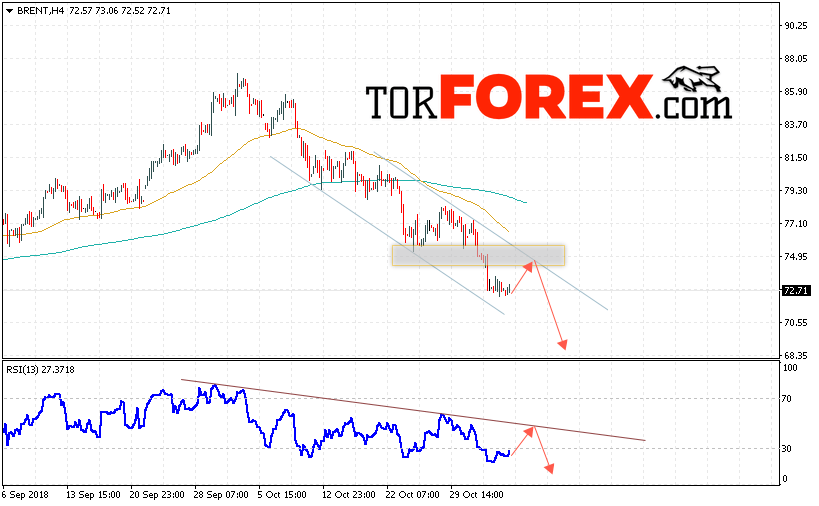 В пользу снижения котировок и цен на нефть BRENT выступит тест линии тренда на индикаторе относительной силы. Подтверждением падения котировок выступит пробой области поддержки и закрытие котировок ниже уровня 71.50. Отменой варианта падения цен на нефть станет сильный рост и пробой уровня 75.80 долларов за баррель, что укажет на пробой верхней границы нисходящего канала и продолжение падения котировок в область выше уровня 79.50.