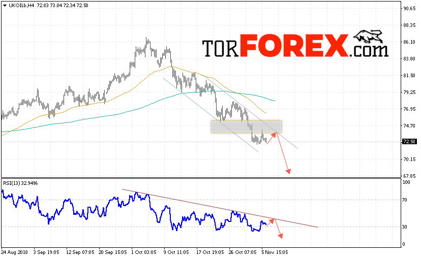 Таким образом, Аналитика и прогноз цен на нефть на 7 ноября 2018 предполагает попытку теста уровня сопротивления вблизи области 73.70 и продолжения падения с целью ниже уровня 67.85. Отменой варианта падения цены нефти BRENT станет сильный рост и пробой уровня 75.50, что укажет на продолжение роста котировок в область выше уровня 79.00.