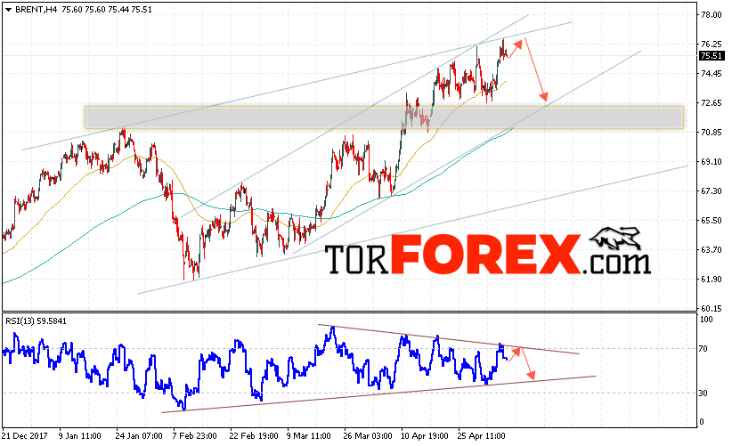 Таким образом, Аналитика и прогноз цен на нефть на 9 мая 2018 предполагает попытку теста уровня сопротивления вблизи области 76.20 и продолжения падения с целью ниже уровня 72.55, отменой варианта падения цены нефти BRENT станет сильный рост и пробой уровня 77.50, что укажет на продолжение роста котировок в область выше уровня 78.50.