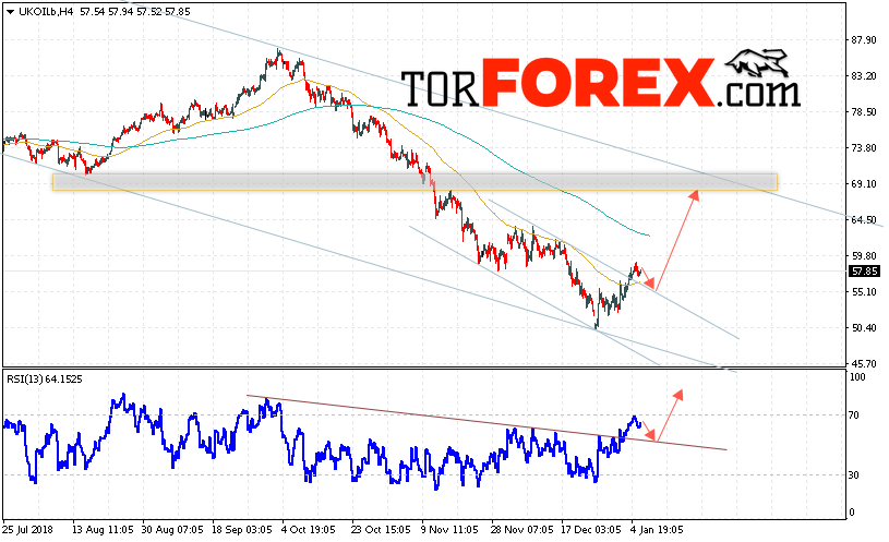 В пользу роста котировок и цен на нефть BRENT выступит тест линии тренда на индикаторе относительной силы. А также отскок от верхней границы нисходящего канала. Отменой варианта роста цен на нефть станет падение и пробой уровня 53.65 долларов за баррель. Это укажет на пробой верхней границы канала и продолжение падения котировок в область ниже уровня 48.05. Подтверждением роста котировок выступит пробой области сопротивления и закрытие цен на BRENT выше уровня 60.00.