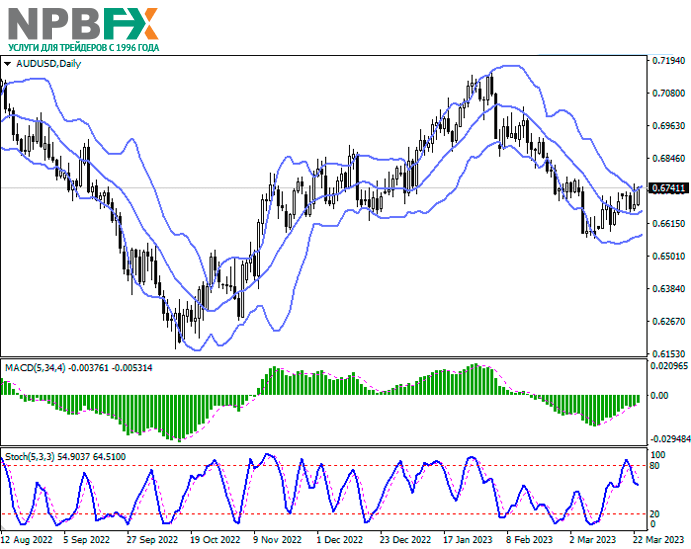 Пара AUD/USD показывает уверенный рост, активно тестируя отметку 0.6740 на пробой вверх и пытаясь закрепиться выше локальных максимумов от 6 марта, обновлённых накануне, когда инструмент отреагировал на решения ФРС США по процентной ставке.