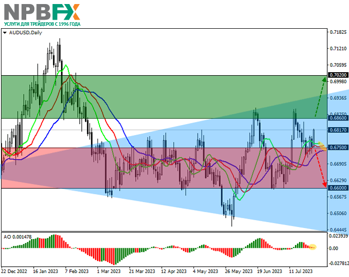 В случае продолжения коррекционного роста актива, а также закрепления цены выше уровня сопротивления 0.6860 будут актуальны позиции на покупку с целью 0.7020. Стоп-лосс — 0.6800. Срок реализации: 7 дней и более.