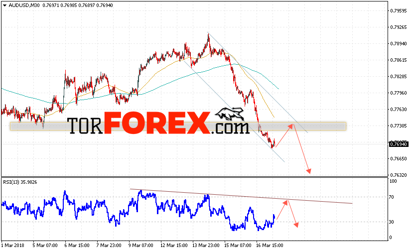 Валютная пара Австралийский Доллар к Доллару США AUD/USD продолжает движение в рамках падения. На данный момент стоит ожидать попытку теста верхней границы нисходящего канала вблизи уровня 0.7730 и продолжение падения котировок в область ниже уровня 0.7630.