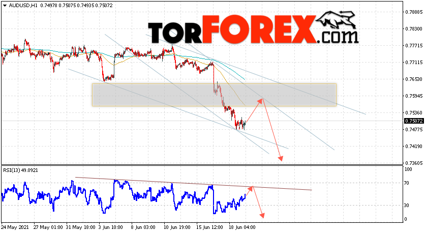 Таким образом, AUD/USD прогноз Форекс и аналитика на 22 июня 2021 предполагает попытку теста уровня сопротивления вблизи области 0.7565. Далее, продолжение падения котировок пары ниже уровня 0.7360. Дополнительным сигналом в пользу падения пары выступит тест линии тренда на индикаторе относительной силы. Отменой варианта снижения станет сильный рост и пробой области 0.7655. Это укажет на продолжение подъёма котировок с потенциальной целью выше уровня 0.8005.