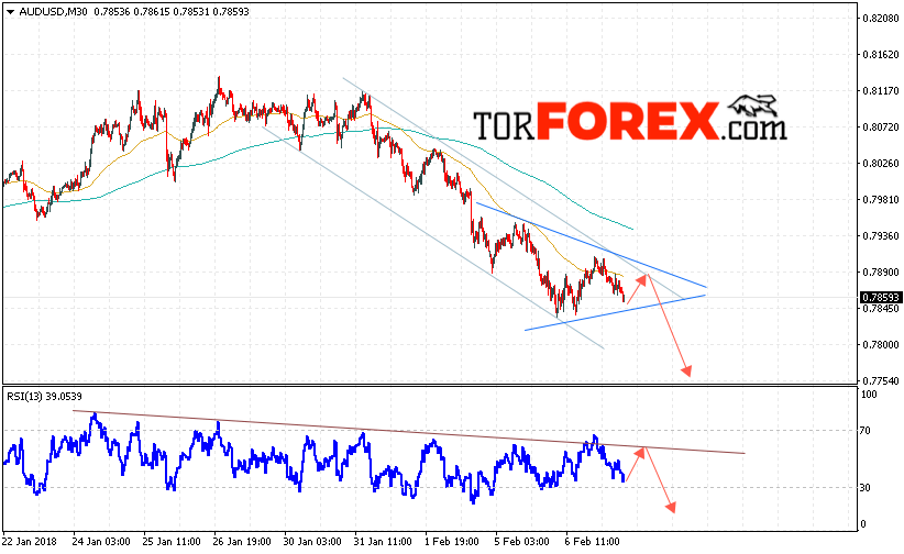 Таким образом, AUD/USD прогноз Форекс и аналитика на 8 февраля 2018 предполагает попытку теста верхней границы канала вблизи области 0.7900 и продолжение падения котировок ниже уровня 0.7750, дополнительным сигналом в пользу падения пары выступит тест линии тренда на индикаторе относительной силы.