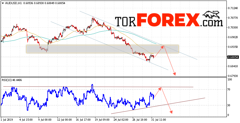 Таким образом, AUD/USD прогноз Форекс и аналитика на 1 августа 2019 предполагает попытку теста уровня сопротивления вблизи области 0.6935. Далее, продолжение падения котировок пары ниже уровня вблизи уровня 0.6795. Дополнительным сигналом в пользу снижения пары выступит тест линии тренда на индикаторе относительной силы. Отменой варианта падения станет сильный рост и пробой области 0.6980. Это укажет на продолжение роста котировок с потенциальной целью выше уровня 0.7155.