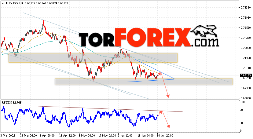 Таким образом, AUD/USD прогноз Форекс и аналитика на 1 июля 2022 предполагает попытку теста уровня сопротивления вблизи области 0.6925. Далее, продолжение падения котировок пары ниже уровня 0.6605. Дополнительным сигналом в пользу снижения пары выступит тест линии тренда на индикаторе относительной силы. Отменой варианта падения станет сильный рост и пробой области 0.7035. Это укажет на продолжение подъёма котировок с потенциальной целью выше уровня 0.7225.