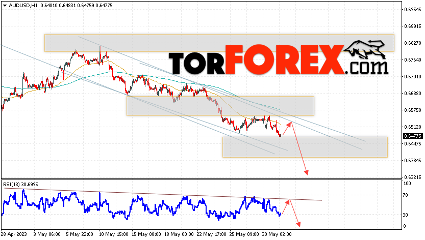 Таким образом, AUD/USD прогноз Форекс и аналитика на 1 июня 2023 предполагает попытку теста уровня сопротивления вблизи области 0.6515. Далее, продолжение падения котировок пары ниже уровня 0.6335. Дополнительным сигналом в пользу снижения пары выступит тест линии тренда на индикаторе относительной силы. Отменой варианта падения станет сильный рост и пробой области 0.6595. Это укажет на продолжение подъёма котировок с потенциальной целью выше уровня 0.6755.
