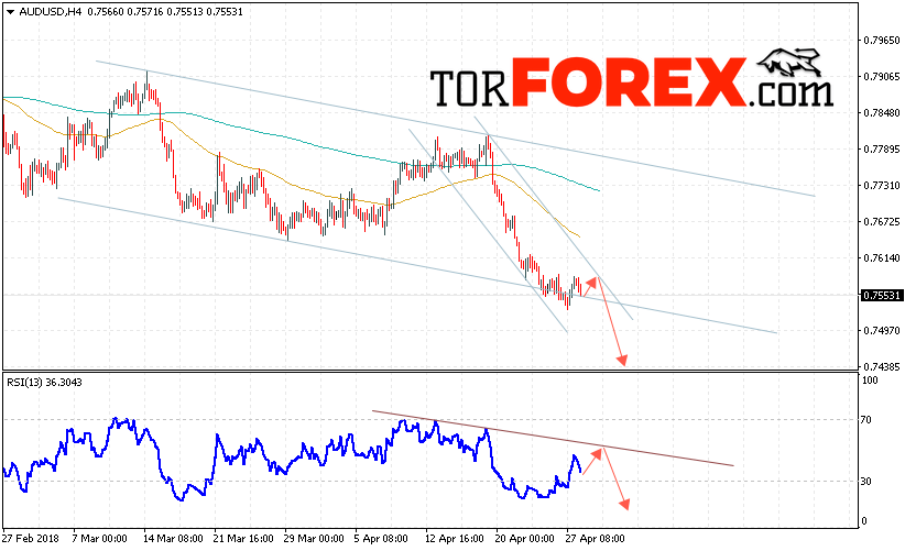 Валютная пара Австралийский Доллар к Доллару США AUD/USD продолжает движение в рамках нисходящего канала. На данный момент стоит ожидать попытку теста области сопротивления вблизи уровня 0.7560 и продолжение падения котировок в область ниже уровня 0.7440.