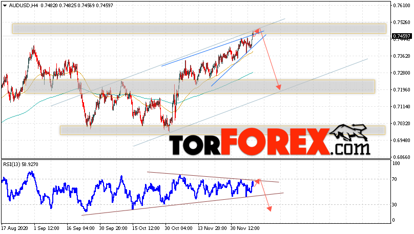 Дополнительным сигналом в пользу снижения валютной пары AUD/USD выступит отскок от линии тренда на индикаторе относительной силы. Вторым сигналом станет отскок от верхней границы медвежьей модели ”Клин”. Отменой варианта падения котировок Австралийского Доллара на Форекс станет сильный рост и пробой уровня 0.7525. Это укажет на пробой области сопротивления и продолжение подъёма валютной пары AUD/USD с потенциальной целью выше уровня 0.7765. Ожидать подтверждения падения пары стоит с пробоем области поддержки и закрытием котировок ниже уровня 0.7345.
