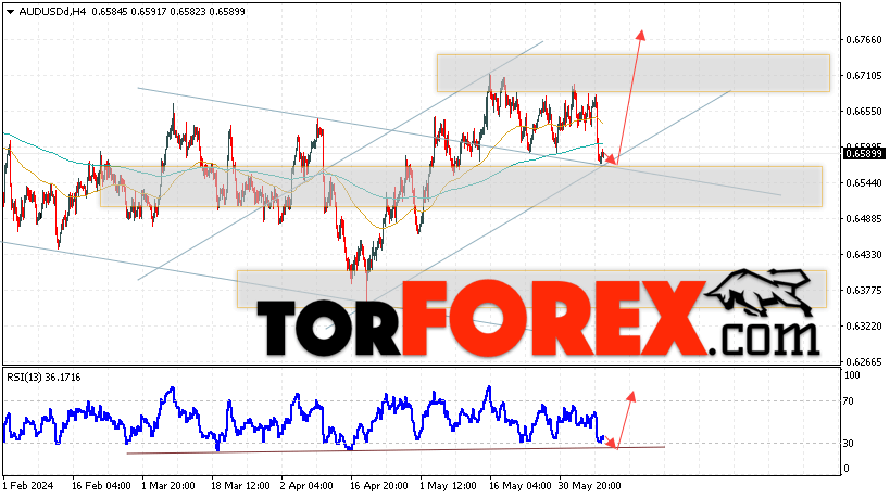 Таким образом, AUD/USD прогноз Форекс и аналитика на 11 июня 2024 предполагает попытку теста уровня поддержки вблизи области 0.6565. Далее, продолжение роста котировок пары выше уровня 0.6770. Дополнительным сигналом в пользу подъёма пары выступит тест линии тренда на индикаторе относительной силы. Отменой варианта падения станет сильный рост и пробой области 0.6505. Это укажет на продолжение подъёма котировок с потенциальной целью выше уровня 0.6315.