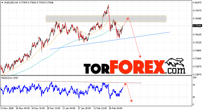 Таким образом, AUD/USD прогноз Форекс и аналитика на 12 марта 2021 предполагает попытку теста уровня сопротивления вблизи области 0.7845. Далее, продолжение падения котировок пары ниже уровня 0.7395. Дополнительным сигналом в пользу падения пары выступит тест линии тренда на индикаторе относительной силы. Отменой варианта снижения станет сильный рост и пробой области 0.7995. Это укажет на продолжение подъёма котировок с потенциальной целью выше уровня 0.8255.