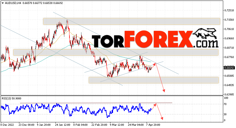 Таким образом, AUD/USD прогноз Форекс и аналитика на 13 апреля 2023 предполагает попытку теста уровня сопротивления вблизи области 0.6725. Далее, продолжение падения котировок пары ниже уровня 0.6405. Дополнительным сигналом в пользу снижения пары выступит тест линии тренда на индикаторе относительной силы. Отменой варианта падения станет сильный рост и пробой области 0.6885. Это укажет на продолжение подъёма котировок с потенциальной целью выше уровня 0.7275.
